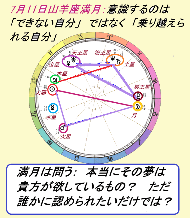 更に、土星は信頼の木星と葛藤の角度。「本当にその夢は貴方が欲しているもの? ただ誰かに認められたいだけでは?」と問いかける。様々なしがらみから自由になって、心から望む未来像へと意識を向けたい。この満月を味方にするには、まず「心の自由を取り戻す」こと。