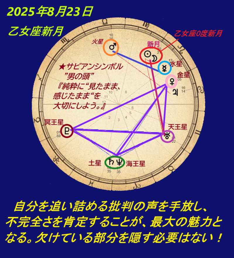 2025年8月23日21時06分、乙女座0度で迎える新月。サビアンシンボルは「男の頭」。余計な感情や思い込みから離れ、純粋に“見たまま、感じたまま“を大事にしようというメッセージ。そうすることで、物事を広げすぎず、焦点を定めることが可能になる。それが未来の飛躍に繋がる鍵。