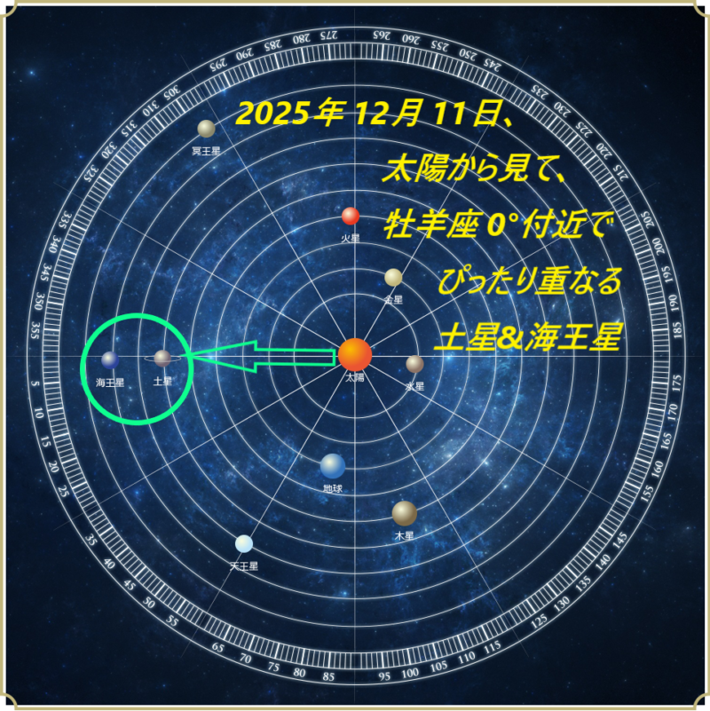 しかし、実は太陽の視点から見ると、2025年12月に既に土星と海王星は牡羊座でぴったり重なっていました。(ヘリオセントリックの視点)