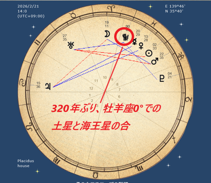 2026年2月21日から22日にかけ、地球から見ると約320年ぶりに土星と海王星が、牡羊座0°でぴったり重なりました!(ジオセントリックの視点)
